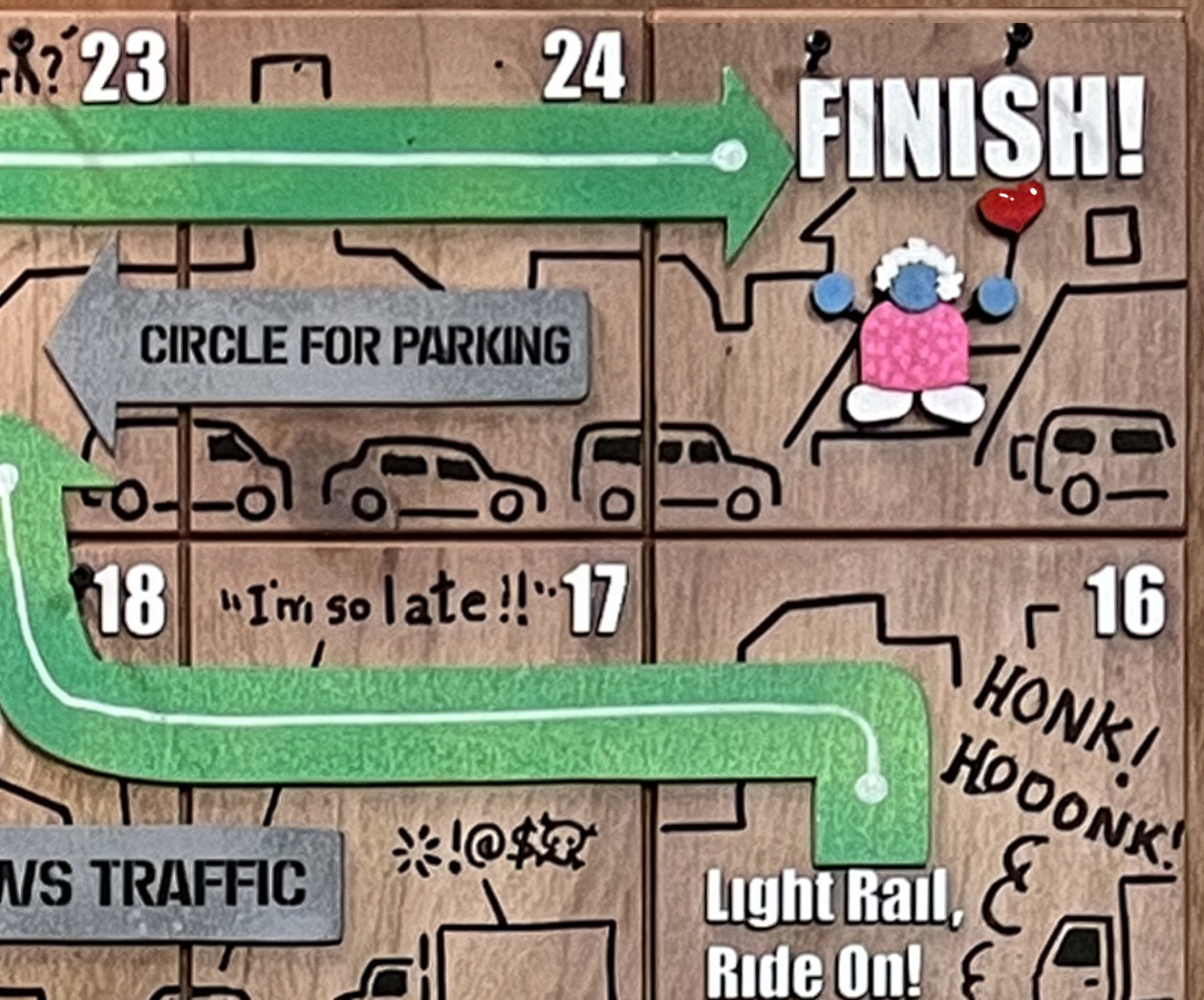 The twins are super late for Mom’s birthday party! Spin the wheel and race them across town and find out who can make it to Mom’s first and deliver her present. Simpler than it looks, this fun ‘snakes and ladders’ style game promotes active mobility with green short cuts like bike lanes, walkways and public transit. Try not to get slowed down in traffic, rush hour or looking for parking though, ugh! Quick game-play allows two players to enjoy a race in about 4 minutes.