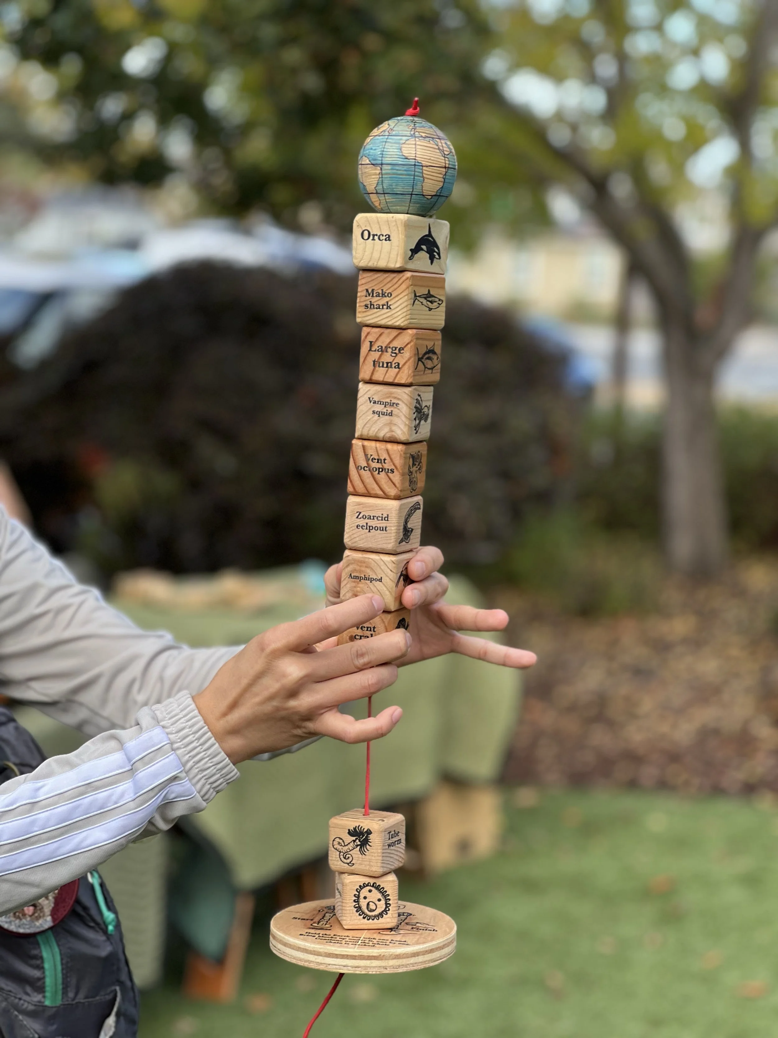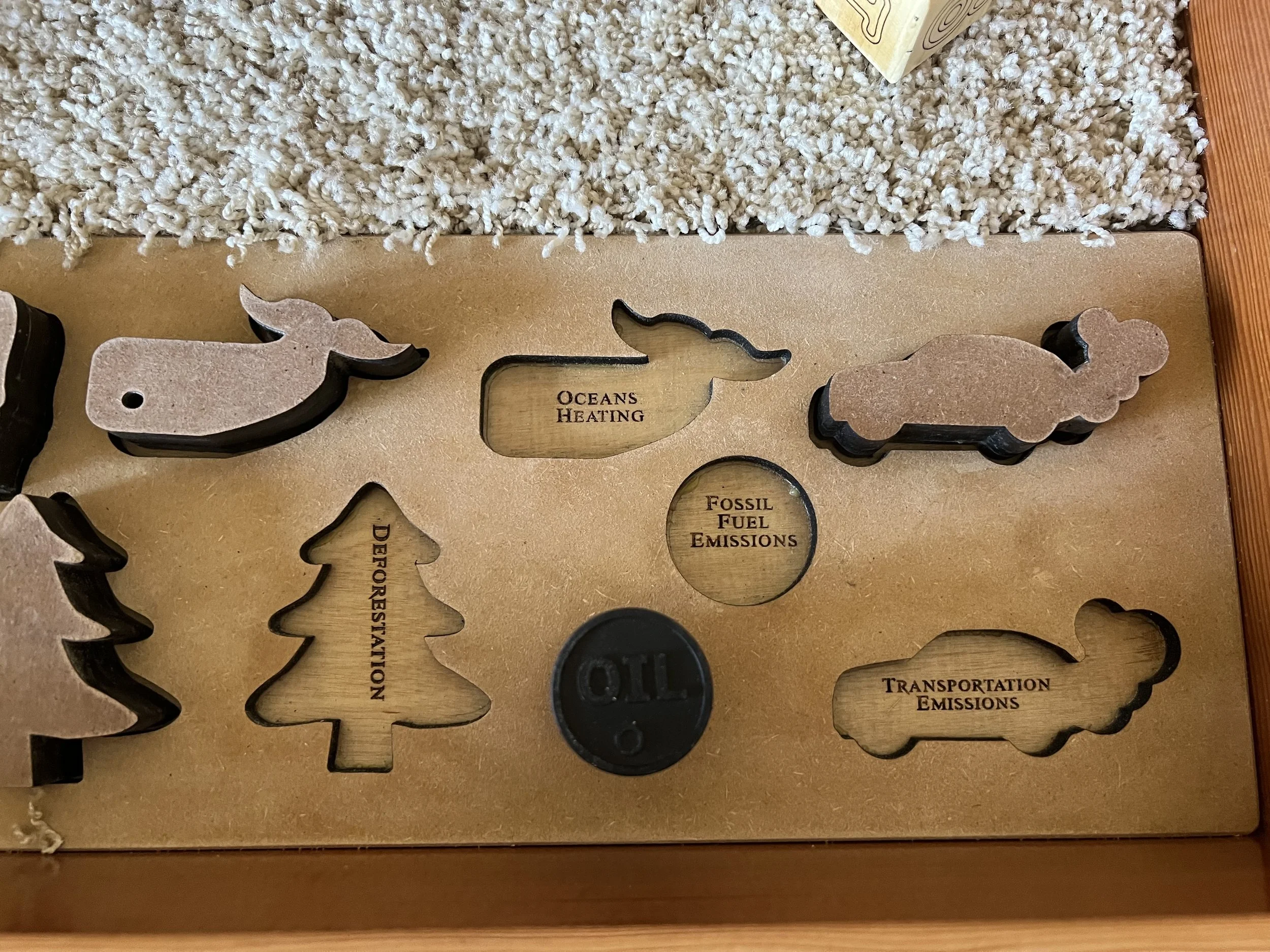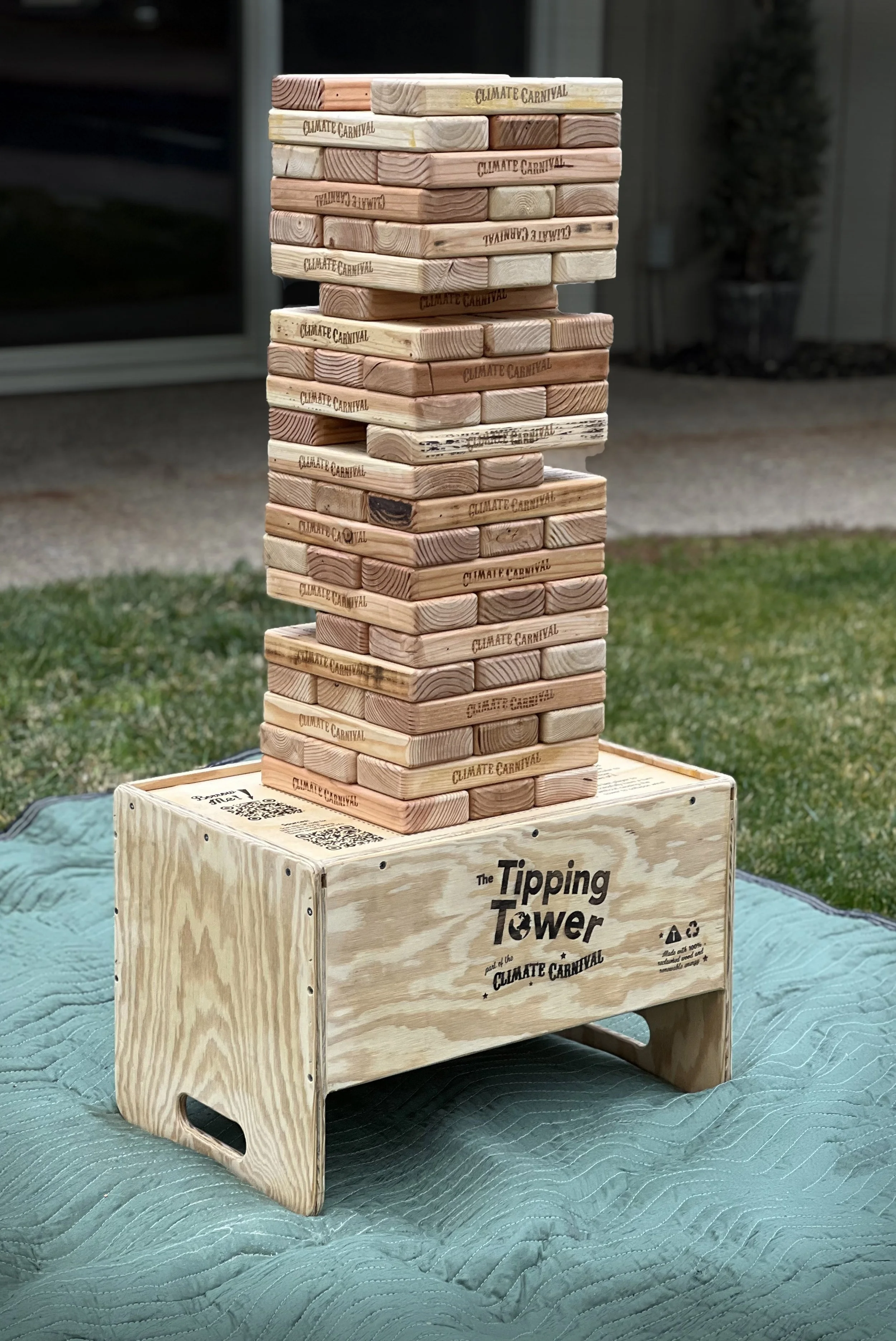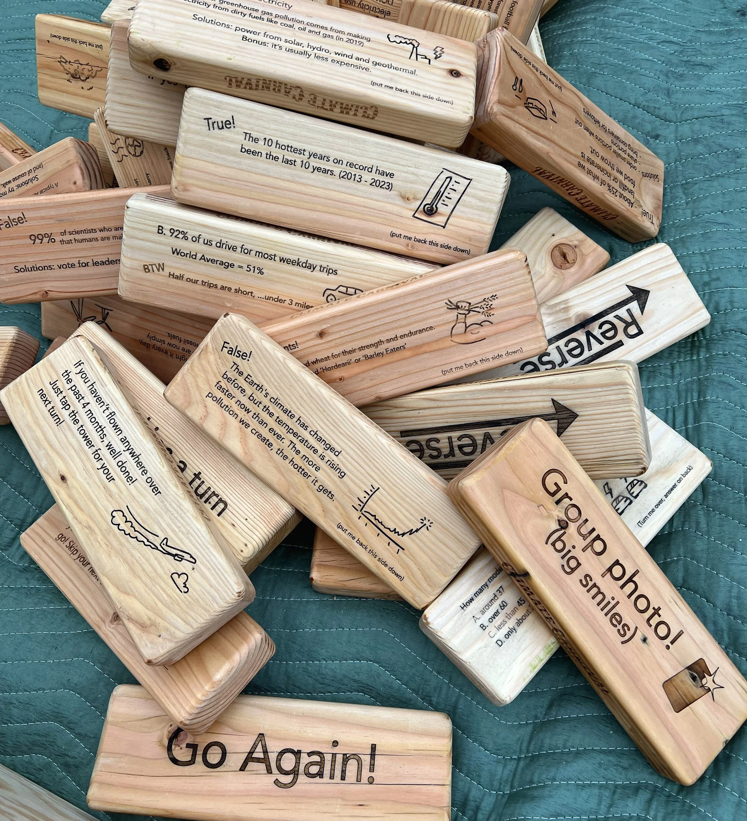 Packed with fun climate info, the Tipping Tower will test your knowledge and your dexterity! Take turns carefully pulling blocks, guessing answers, and stacking the tower higher and higher until… it tips. Last person to go before it tumbles, wins! A QR code on the base box links to •this page• with all the source information used in the climate quiz questions.